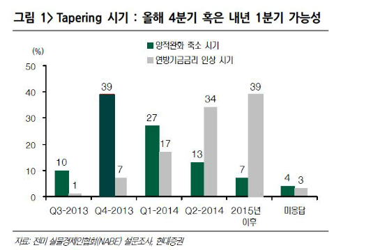 ¹Ì±¹³» ½Ç¹°°æÁ¦ÀÎÇùȸ(NABE) ¼³¹®Á¶»ç¿¡¼µµ ¿Ã 3ºÐ±â¿¡ QE Ãà¼Ò°¡ ³ªÅ¸³¯ °ÍÀ¸·Î º¸´Â ½Ã°¢Àº ¸î°³¿ùÀü°ú ºñ±³½Ã ´ë Æø °¨¼ÒÇß´Ù. ¿¬¸» ³»Áö ³»³â »ó¹Ý±â¸¦ ½ÃÁ¡À¸·Î º¸´Â ½Ã°¢ÀÌ À̹ø ¼³¹®Á¶»ç¿¡¼´Â ¿ìÀ§¸¦ Â÷ÁöÇß´Ù.