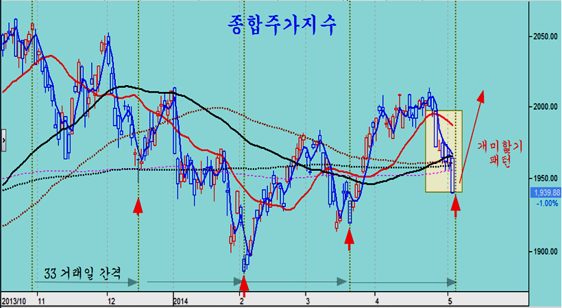 °³¹ÌÇÓ±â ÆÐÅÏ. 4¿ù 25ÀÏ 1.34%ÀÇ Å« Ç϶ôÀ» ÇÑ ÈÄ, 4Àϰ£ÀÇ Á¼Àº Á¶Á¤À» °ÅÃÄ ÁöÁö±Ç¿¡ ¸Ó¹«´Â µí Çß´ø Á¾ÇÕÁÖ°¡Áö¼ö´Â ¿À´Ã ÁÖ¿ä ÁöÁö±ÇÀ» ÀÌÅ»ÇÏ¸é¼ ÀçÂ÷ 1.0%´ëÀÇ Å« Á¶Á¤ÀÌ ³ªÅ¸³µ´Ù. °ÇÑ Ç϶ôÈÄ 3~4ÀÏ Á¤Ã¼ÇÑ ÈÄ »ó½ÂÀ» ±â´ëÇÒ ¶§ ÀçÂ÷ Å« Ç϶ôÀ» ÇÏ¿© ½É¸®ÀûÀÎ Ãæ°ÝÀ» °¡Àå Å©°Ô ¸¸µå´Â ¹è¿ÀÇ °³¹ÌÇÓ±â ÆÐÅÏÀÌ´Ù.