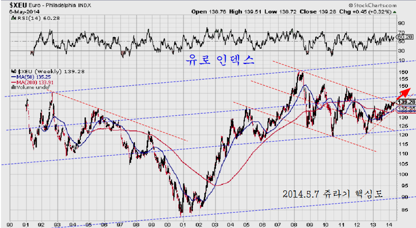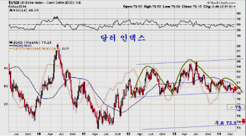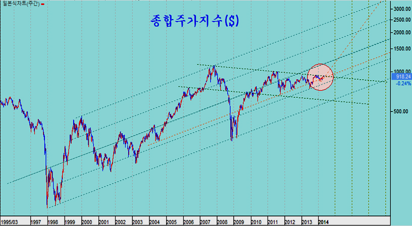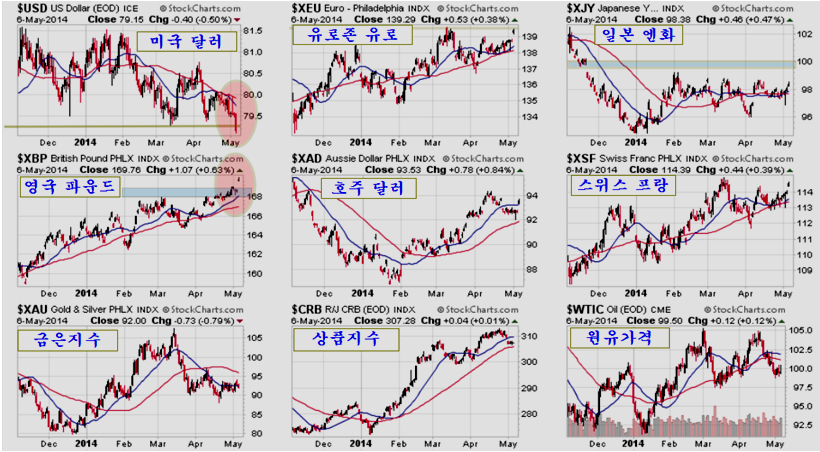 Áö¼ö´Â ¸¸±â ÈÄ »ó½ÂÀ¸·Î ¿òÁ÷À̱⠽±´Ù°í ÇÒ ¼ö Àִµ¥, ¿©±â¼ÀÇ »ó½ÂÀº ´ë¼¼ Ãß¼¼ÀÇ °üÁ¡¿¡¼ ¸Å¿ì Áß¿äÇÑ Àǹ̸¦ °®´Â´Ù. ÁÖ°¡ Áö¼ö¸¦ °ü¸®ÇÏ¿© ±×¸®´Â ±Û·Î¹ú ¸ÞÀÌÀúÀÇ °üÁ¡¿¡¼ ´Þ·¯¸¦ ±âÁØÇÏ¿© Á¾ÇÕÁÖ°¡Áö¼ö¸¦ º¸¸é 2007³â °íÁ¡°ú 2011³â 4¿ù °íÁ¡, 2013³â 10¿ù °íÁ¡À» ÀÕ´Â ´ë¼¼ ÀúÇ× Ãß¼¼ »ó¿¡ Á¾ÇÕÁÖ°¡Áö¼ö°¡ ³õ¿© ÀÖ´Ù. ±×°£ ÁÖ°¡Áö¼ö°¡ Ç϶ôÇßÀ½¿¡µµ ´Þ·¯ °¡Ä¡°¡ Ç϶ôÇÏ¸é¼ ¿ø/´Þ·¯ ȯÀ²ÀÌ Ç϶ôÇÑ ´öºÐ¿¡ ´Þ·¯ Ç¥½Ã Á¾ÇÕÁÖ°¡Áö¼ö´Â Å©°Ô Ç϶ôÇÏÁö ¾Ê°í ÀúÇ× Ãß¼¼ µ¹ÆÄÀÇ º¯°îÁ¡ »ó¿¡ ÀÖ´Ù.