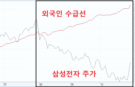 »ï¼ºÀüÀÚ´Â À§ ±×¸²¿¡¼ º¸µí 8~10¿ù ±¸°£¿¡¼ ÁÖ°¡°¡ Ç϶ôÇÏ´Â °úÁ¤¿¡¼µµ ¿Ü±¹ÀÎÀº ¼ø¸Å¼ö¸¦ Áö¼ÓÇß´Ù. ¹°¸®¸é¼ Ãß°¡¸Å¼öÇÑ °ÍÀÌ´Ù. ±×¸®°í Áö±ÝÀº ¿Ü±¹ÀÎÀÌ À̸¦ ¸¸È¸Çϱâ À§ÇØ »ï¼ºÀüÀÚÀÇ ¹Ý°ÝÀ» ÁÖµµÇÏ´Â °ÍÀÌ´Ù. À̸¦ ÅëÇØ º¸¸é »ï¼ºÀüÀÚ´Â Ãß°¡·Î ¿Ã¶ó¾ß Çϰí ÀÌ °úÁ¤¿¡¼ Áö¼öÀÇ Ãß°¡¹Ýµî ¿¬°áÀÌ ³ªÅ¸³¯ ¼ö ÀÖ´Ù.