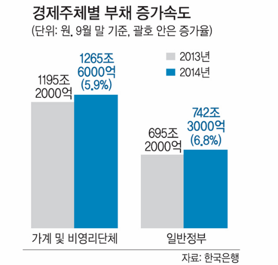 ¹®Á¦´Â Çѱ¹ÀÇ ³»¼ö ºÒ¾ÈÀÌ´Ù. Çѱ¹ÀÇ °¡°èºÎä´Â 3ºÐ±â ¸» ±âÁØÀ¸·Î 1266Á¶¿øÀ¸·Î Áý°èµÇ¾ú´Ù. ÀÌ´Â 2ºÐ±â ¸» ´ëºñ 23Á¶6000¾ï¿øÀÌ Áõ°¡µÈ ¼öÄ¡´Ù. ¾Æ¿ï·¯ ¿¬°£ GDP 1469Á¶¿øÀÇ 86%¿¡ ´ÞÇÏ´Â ±Ô¸ð´Ù. ¿¬Æò±Õ ÀÌÀÚÀ²À» 5%·Î Àâ´Â´Ù¸é ¿¬°£ 62Á¶¿øÀÌ ÀÌÀÚ ºñ¿ëÀ¸·Î¸¸ ¼Ò¿äµÇ°í ÀÖ´Ù´Â Àǹ̰¡ µÈ´Ù. ÀÌ·± »óȲ¿¡¼ ¼Òºñ°¡ À§ÃàµÇ´Â°Ç ´ç¿¬ÇÏ´Ù.