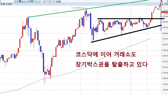 °Å·¡¼Ò Áö¼ö´Â Áö³ 1¿ù ÀÌÈÄ °è¼Ó °íÁ¡À» ³ôÀ̰í ÀÖ´Ù. ±×¸®°í ÄÚ½º´Ú¿¡ ÀÌ¾î °Å·¡¼Òµµ Àå±â ¹Ú½º±ÇÀ» µ¹ÆÄÇß´Ù. °Å·¡¼ÒÀÇ ´ë¼¼ ÆÄµ¿ÀÌ ½ÃÀÛµÈ °ÍÀÌ´Ù. ÀÌ¹Ì ¾Õ¼ ÄÚ½º´Ú¿¡¼ È®ÀεǾúµí Àå±â ¹Ú½º±ÇÀ» µ¹ÆÄÇÑ Áö¼ö´Â ½±°Ô ²©ÀÌÁö ¾ÊÀ¸¸é¼ »ó´ç±â°£ ¿ì»óÇâ »ó½ÂÀ» ±×¸°´Ù. ¸¶Âù°¡Áö·Î °Å·¡¼Òµµ ÀÌÁ¦ºÎÅÍ ±×·± È帧À» º¸¿©³ª°£´Ù°í º¸¸é µÈ´Ù.