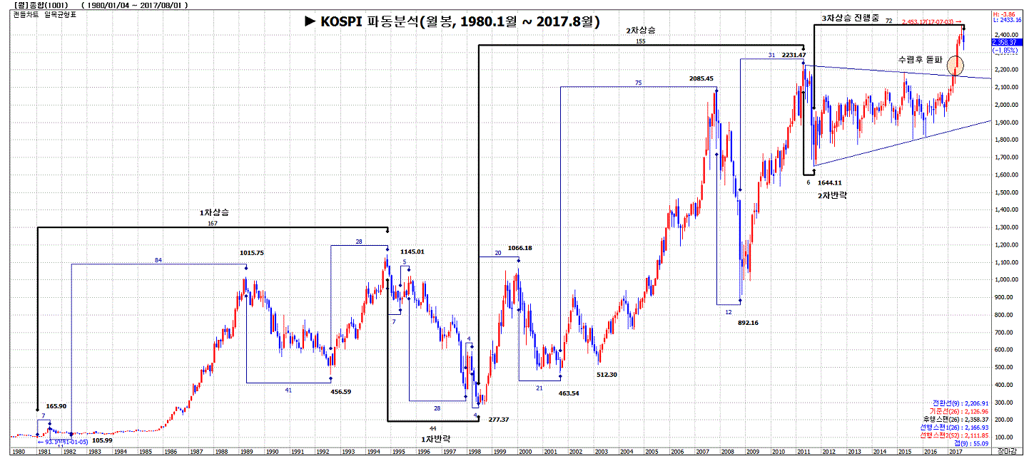 °á·Ð : ¿ì¸®³ª¶ó ÄÚ½ºÇÇ Á¾ÇÕÁö¼ö À§Ä¡´Â ÇöÀç 3Â÷»ó½Â ½Ã±â·Î »ó½ÂÁß ¹Ý¶ô Á¶Á¤¹Þ´Â ÁßÀ¸¸ç Áö³¹ø ¿ª»çÀû°íÁ¡ 2,231.47PÀüÈÄ 2,230 ~2,260PºÎ±Ù¿¡¼ Á¶Á¤À» ¸¶¹«¸®Çϰí Àç»ó½ÂÀÌ ¿¹»óµÊ 1. 1Â÷»ó½Â : 1981.1¿ù~1994.11¿ù(+968.71P, +916.47%»ó½Â) - ´ë¹Ù´Ú 93.10 ~ õÁ¤ 1145.01±îÁö 167°³¿ù µ¿¾È 968.71Æ÷ÀÎÆ® »ó½ÂÇÏ°í »ó½Â·üÀÌ +916.47%±â·Ï - 1979³â ¹ÚÁ¤Èñ´ëÅë·É¼°ÅÈÄ 1980³â ¸¶À̳ʽº °æÁ¦¼ºÀåÀÌÈÄ ¼¼È÷ °æÁ¦°¡ ¾ÈÁ¤À» ã¾Æ°¨ - 1985³â 3ÀúÈ¿°ú·Î ´ë±Ô¸ð ¹«¿ª¼öÁö ÈæÀÚ·Î ÀÎÇÑ ³ôÀº °æÁ¦¼ºÀå·ê·Î 1989³â 1000Æ÷ÀÎÆ®´Þ¼º ¹× ÁÖ½ÄÅõÀÚ°¡ ´ëÁßȵǴ ½Ã±â - ÀÌÈÄ °æ±âÇϰ°ú »óÀå±â¾÷ÀÇ ´ë±Ô¸ð À¯»óÁõÀÚ·Î ÀÎÇÑ ÁÖ°¡°¡ ´ëÆø¶ôÇÏ¿© 1992.8¿ù¿¡´Â 456.59±îÁö Ç϶ô - 456.59¸¦ ÀúÁ¡À¸·Î ÇÏ¿© ¿Ü±¹ÀÎ Áõ½Ã°³¹æ µîÀ¸·Î ÀçÂ÷ »ó½ÂÇÏ¿© 1994.11¿ù ÀçÂ÷ 1000Æ÷ÀÎÆ® µ¹ÆÄÇÏ¿© 1145.01ÀÇ ¿ª»çÀû°íÁ¡À» Çü¼º (ÀúPERÇõ¸í, ÀÚ»êÁÖ Æøµî) - ±øÅë°èÁ Á¤¸®, Áõ½Ã¾ÈÁ¤±â±Ý¼³¸³, ºÎµ¿»ê °¡°ÝÆøµîÀ¸·Î Àü¼¼°è¾à±â°£ 2³âÀ¸·Î º¯°æ, ÀÏ»ê,ºÐ´çµî 1±â ½Åµµ½Ã °Ç¼³,ÇØ¿Ü¿©ÇàÀÚÀ¯È, °ú¼Òºñ ¹æÁö Ä·ÆäÀÎ µîÀÌ »ý°¢³ª³×¿ä 2. 1Â÷¹Ý¶ô : 1994.11¿ù~1998.10¿ù(-776.53P, -72.28%Ç϶ô) - õÁ¤1145.01 ~ ¹Ù´Ú277.37±îÁö 44°³¿ù µ¿¾È 776.53Æ÷ÀÎÆ® Ç϶ôÇϰí Ç϶ô·üÀÌ -72.28%±â·Ï - °ø°ø ºÎ¹® ºñ´ëÈ, ÀÎÀ§ÀûÀÎ °æ±âºÎ¾ç µîÀ¸·Î ´ë±Ô¸ð °æ»ó¼öÁö ÀûÀÚ ¹× ´Ü±â¿Üä±ÞÁõ µîÀ¸·Î ´ë¼¼Ç϶ô ½Ã±â - °á±¹ ¿ÜȺÎÁ·À¸·Î IMF±¸Á¦±ÝÀ¶½Åû ¹× ±è´ëÁß´ëÅë·É ´ç¼± ÈÄ ´ë±Ô¸ð ±¸Á¶Á¶Á¤ ½Ç½Ã - ÀÛÀüÁÖ°¡ ¸¸°³ÇÏ´ø½Ã±â(ºÎ±¤¾àǰ, ´ë¿µÆ÷Àå,´ë¼ºÀÚ¿ø, µ¿¿ø, »ïÇ¥Á¦ÀÛ¼Ò µî), ºòµô, ½ºÆ¼ºê¸¶ºó, Á¶Áö¼Ò·Î½º, ±øµå½¬,µ¿ÀüÁÖ(100¿ø)µ¿¼Áõ±Ç,°í·ÁÁõ±Ç ºÎµµ µîÀÌ »ý°¢³ª³×¿ä 3. 2Â÷»ó½Â : 1998.10¿ù ~ 2011.4¿ù(+1,894.48P, +653.99%»ó½Â) - ¼º°øÀûÀα¸Á¶Á¶Á¤°ú ¹«¿ª¼öÁö ´ë±Ô¸ð ÈæÀÚ·Î ´ë¹Ù´Ú277.37P¿¡¼ 10°³¿ù¸¸¿¡ 1,000Pµ¹ÆÄÇϰí 2000³â 1¿ù 1066.18±â·Ï - ÀÌÈÄ °æ±âħü ¹× 9.11Å×·¯ ¹ß»ýÀ¸·Î 463.54P±îÁöÇ϶ô - 2003.3¿ù ¹Ì±¹ÀÇ À̶óÅ©ÀüÀï ¹ß¹ßÈÄ 512.30P¿¡¼ ¼¼°è°æÁ¦ ȣȲ ¹× Áß±¹°æÁ¦ °í¼ºÀå¿¡ µû¸¥ ¼öÇýµîÀ¸·Î ´ë¼¼ »ó½Â±â Çü¼ºÇÏ¿© ÆÝµåµî¿¡ ´ë±Ô¸ð·Î ÀÚ±ÝÀÌ À¯ÀԵǸç 2000P´ë·Î »ó½ÂÇÏ¿© 2007.11¿ù¿¡ 2085.45 °íÁ¡ Çü¼º - ±×·¯³ª, ¹Ì±¹¹ß ¼ºêÇÁ¶óÀÓ ¸ð±âÁö »çÅ ¹ß»ýÀ¸·Î ÀÎÇÑ ¼¼°è°æÁ¦ ´ëÈ¥¶õµîÀ¸·Î 2008.10¿ù¿¡ 892.16±îÁö Æø¶ô - ±×ÈÄ ±Ý¸®ÀÎÇÏ, ¾çÀû¿ÏÈÁ¤Ã¥µî Áß¾ÓÀºÇàÁ¤Ã¥ÀÌ ¼º°øÇϸç 2000P´ë ´Ù½Ã ȸº¹ÇÏ¿© 2011.4¿ù¿¡ 2231.47±â·Ï - ºòµô, 400¾ïºÒ ¹«¿ª¼öÁöÈæÀÚ, IMFÁ¶±âÁ¹¾÷, ¹ÙÀÌÄÚ¸®¾Æ¿Ç³, Ä«µå»çÅÂ, ¹Ì·¡¿¡¼Â ÀλçÀÌÆ®ÆÝµå, Á¶¼±ÁÖ, Â÷ÈÁ¤, STX±×·ì µîÀÌ »ý°¢³ª³×¿ä 4. 2Â÷¹Ý¶ô : 2011.4¿ù ~ 2011.9¿ù(-422.71P, -19.28%Ç϶ô) - ¹Ì±¹ ±¹°¡½Å¿ëµî±ÞÇ϶ôÀ¸·Î ÀÎÇÏ¿© 6°³¿ù µ¿¾È 2231.47¿¡¼ 1644.11P·Î ÁÖ°¡ ±Þ¶ô - ¿©¸§ÈÞ°¡±â°£µ¿¾ÈÀÎ 8¿ù´ÞÀÇ ÃÊ´Ü±â Æø¶ôÀÌ ±â¾ï³ª³×¿ä 5. 3Â÷ »ó½Â ÁøÇàÁß(2011.9¿ù ~ ÇöÀç) - 2011.9¿ù 1644.11P¸¦ ¹Ù´ÚÀ¸·Î 6³â µ¿¾ÈÀÇ ¼ö·Å(¶Ç´Â ¹Ú½º±Ç)À» 2017.5¿ù¿¡ µ¹ÆÄÇÏ¿© 8°³¿ù ¿¬¼Ó ¾çºÀ ½Å±â·ÏÀ» ¼¼¿ì°í ÇöÀç Á¶Á¤ÁßÀÓ - Á¶Á¤Àº Àü¿ª»çÀû °íÁ¡ÀÎ 2231.47PÀüÈÄ¿¡¼ ¸¶¹«¸®µÉ °ÍÀ¸·Î ¿¹»óµÊ . ³¡.